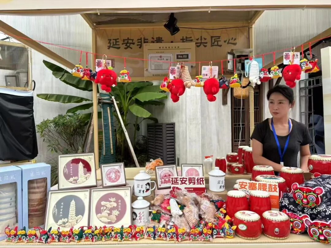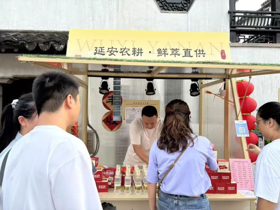 以“延州礼”平台为核心的“延安集市”,创新打造水果区、农副产品区、非遗文创区等六大农文旅展销区,将文化体验与消费场景无缝衔接。洛川苹果红润饱满、延川红枣甘甜绵密、吴起小杂粮质朴天然,琳琅满目的优质农产品引得游客竞相品尝选购;剪纸艺人指尖翻飞,麦秆画匠人精雕细琢,陕北刺绣针脚细密,一件件非遗文创产品既承载着民俗记忆,又焕发着现代审美意趣。游客在沉浸式体验中,不仅能亲手挑选心仪产品,更能将延安的味道与风情“带回家”。活动期间,展区日均客流量突破万人次,农产品与非遗文创销售额显著增长,文化消费潜力得到充分释放。