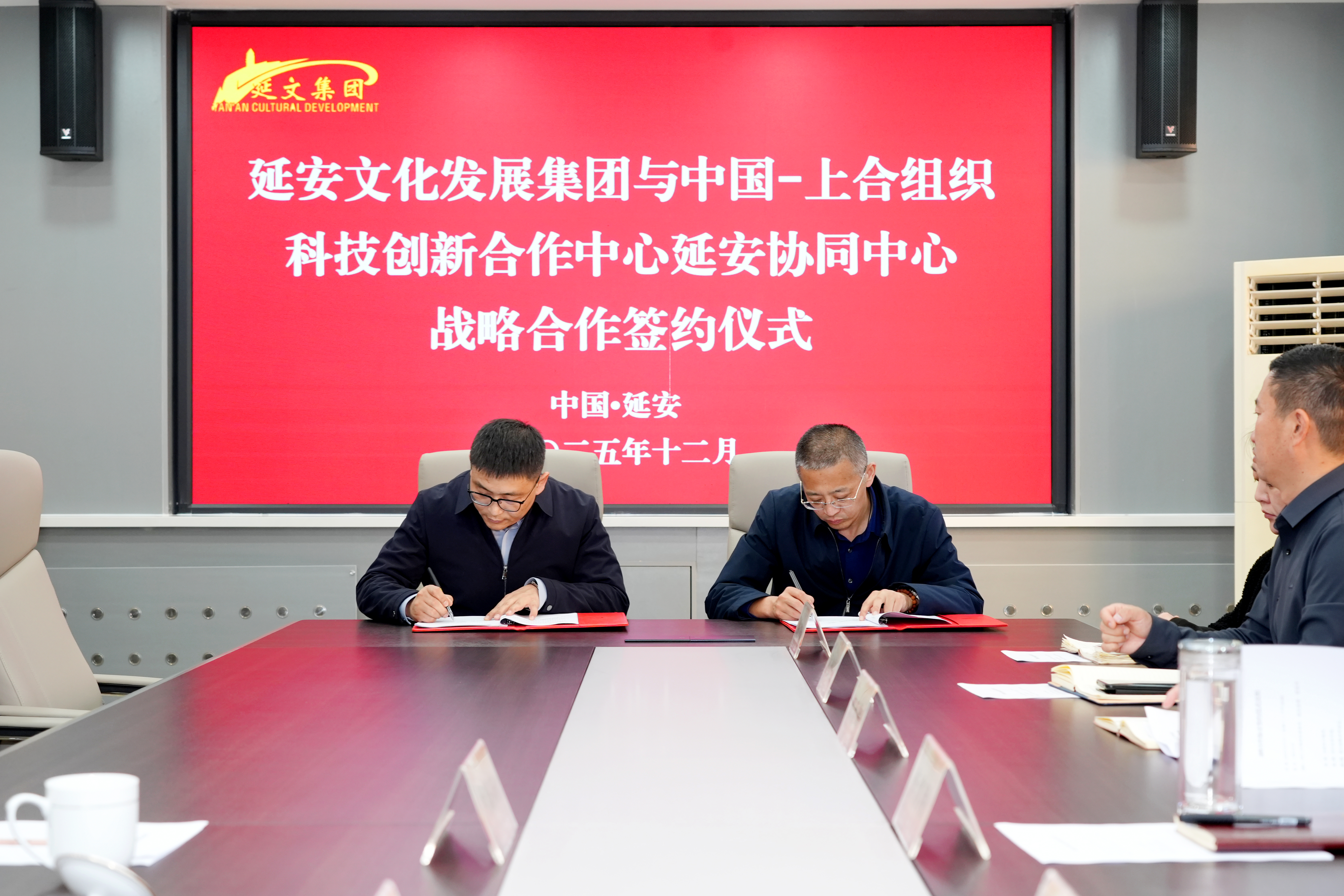 2025年12月3日,延安文化发展金沙乐娱城与中国-上海合作组织科技创新合作中心延安协同中心签订战略合作协议。中国-上海合作组织科技创新合作中心延安协同中心主任杜晓昀、秘书长韩冰冰,延安文化发展金沙乐娱城党委副书记、总经理李鸿翔,党委副书记陶延伟,党委委员、副总经理郭延伟及相关部室负责人参加签约仪式。此次战略合作签约是金沙乐娱城深入贯彻落实习近平总书记关于共建“一带一路”系列重要讲话精神,推动延安文化走向世界、讲好新时代延安故事的重要举措。